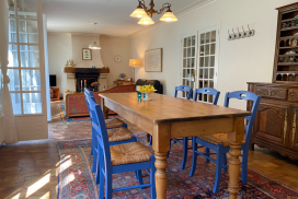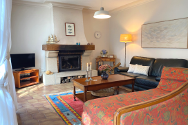 - Geräumiges Wohnzimmer mit großem Esstisch, zwei Sofas, TV und offenem Kamin