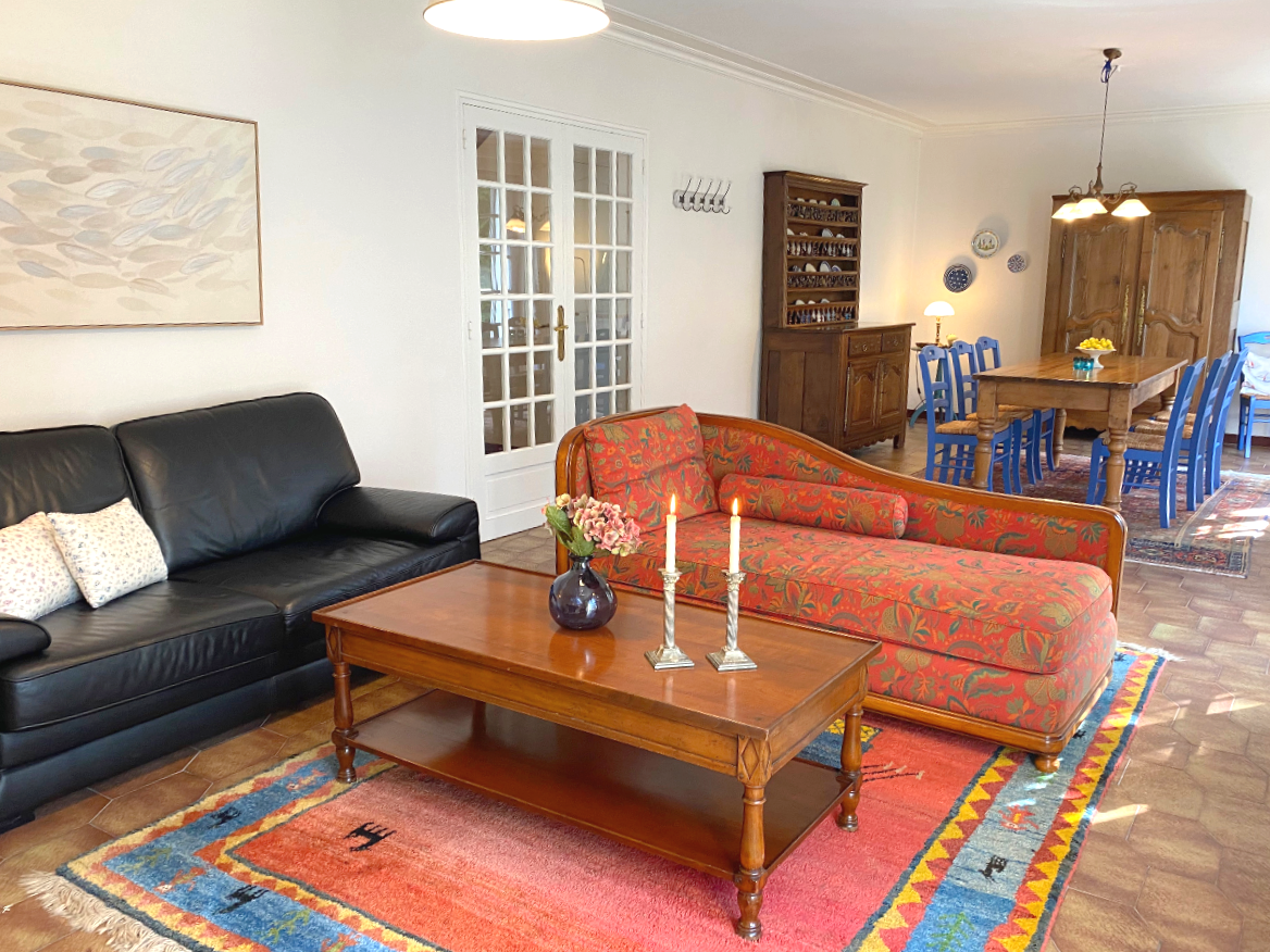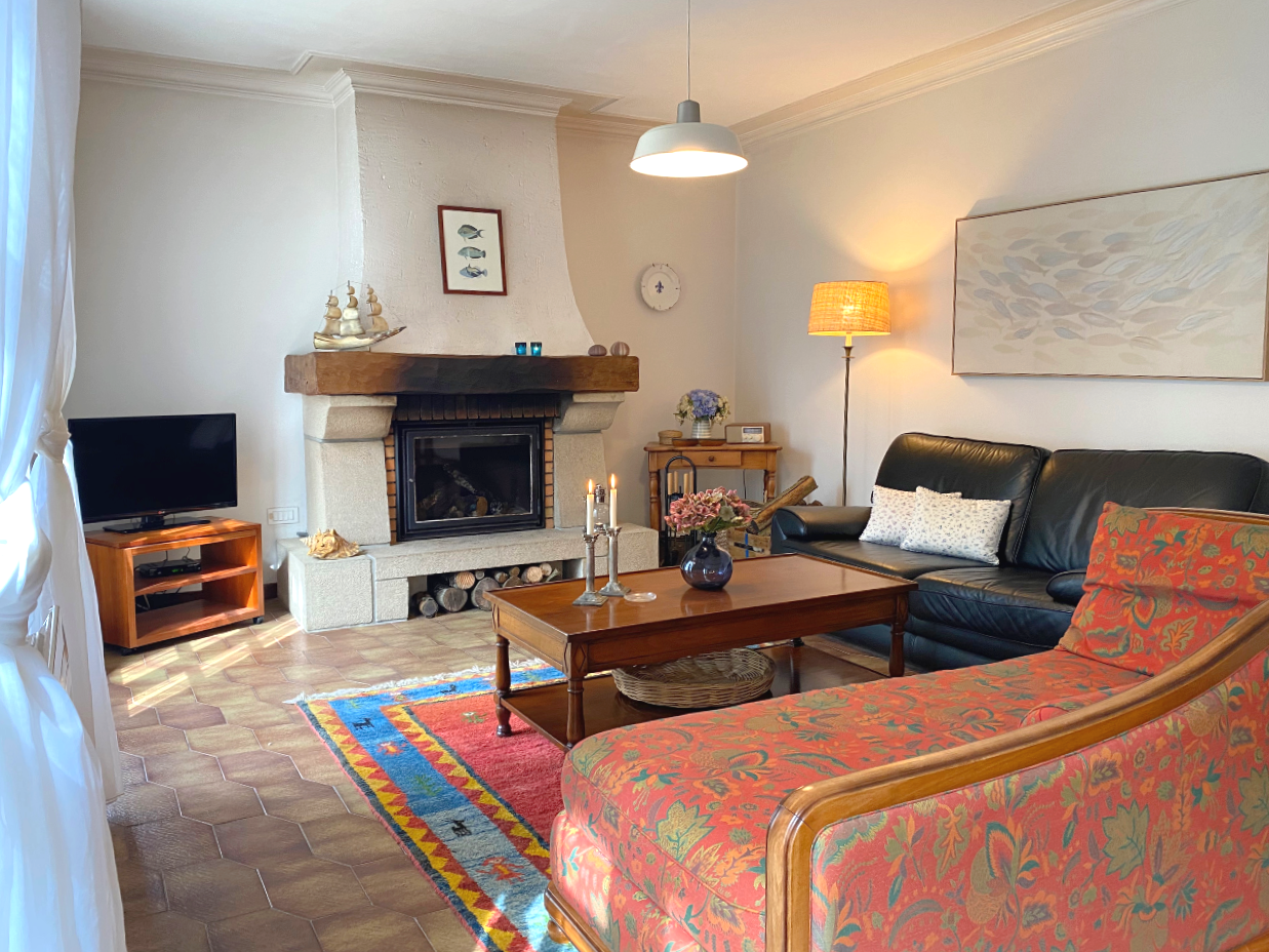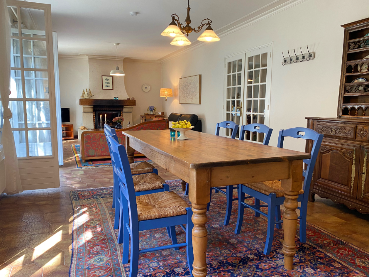 - Geräumiges Wohnzimmer mit großem Esstisch, zwei Sofas, TV und offenem Kamin